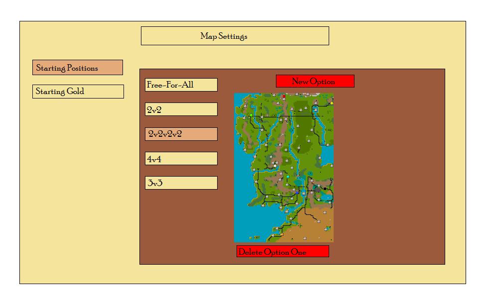 1) The map creator is given a section, "Starting Positions", which leads with a dropdown menu "Set options for..." FFA, 2v2, 2v2v2, etc. Let's say they choose 2v2v2v2. This opens a normal interactive minimap where the possible spawn cities are shown. All cities on the map can be considered possible starting locations; it won't matter. The creator simply selects a starting city and sets its team from another popup menu "Random, Team 1, Team 1, Team 2, Team 2, and so on). The options disappear as they are used (With the exception of random obviously), and when the total number of slots is filled (8 randoms and/or specific team placements) the menu empties (you can't program more than the gametype you chose). Here I would like to note that you could later include other options allowing more than one starting city per player, without changing the basic framework and premise. When finished, you hit button "Save Setting" and the minimap is frozen and labeled "Option One". It's clearly readable, each castle labeled "R" or with the team number. The original dropdown menu and two buttons are left in the page: one below the save titled "Delete" and another button at the top of the page titled "New Option". The player may continue this for different numbers of players, different team groupings, and so on until satisfied. He may even set different possibilities for different FFA groupings (set none for 5 players, allow only specific balanced setups for 4 players, and so on).